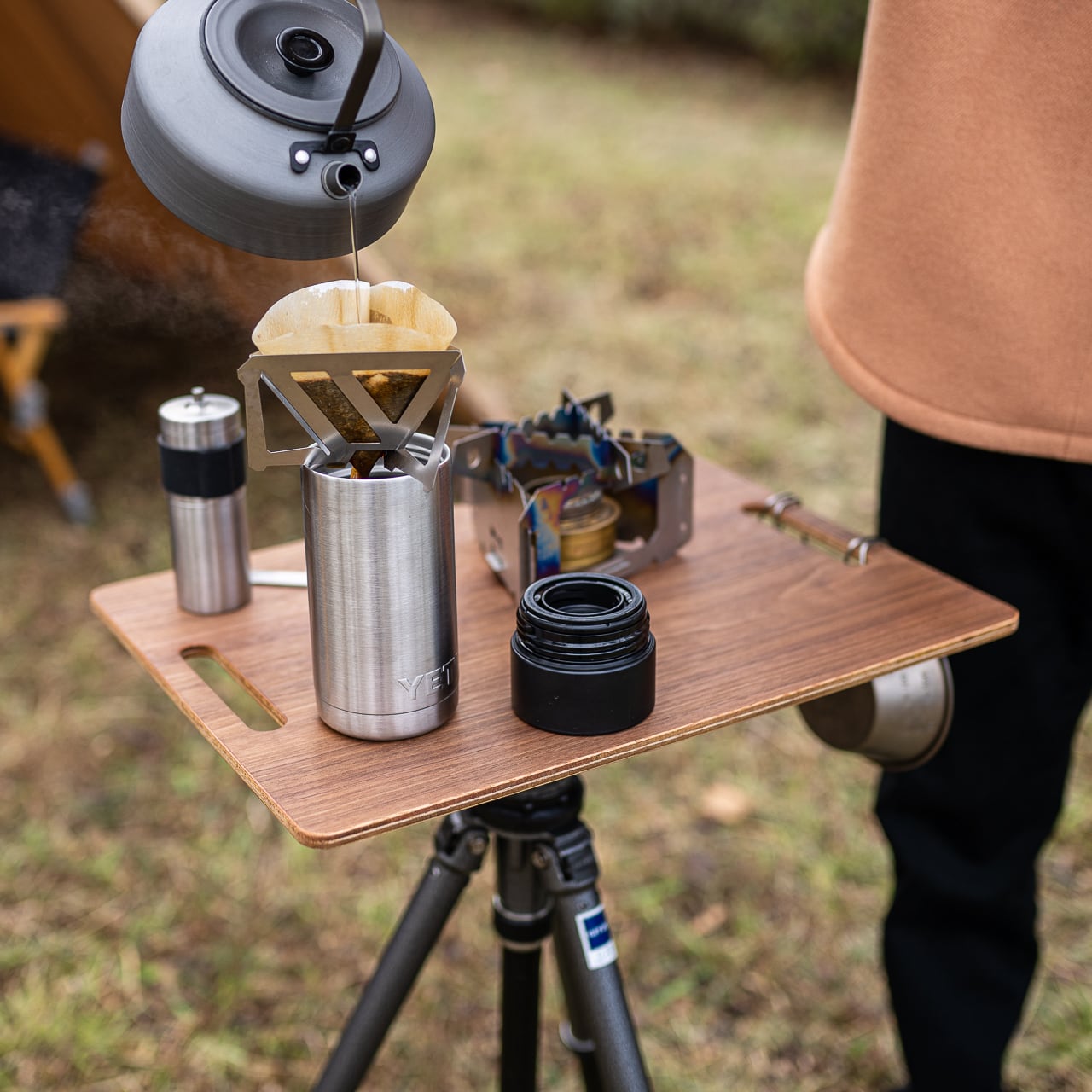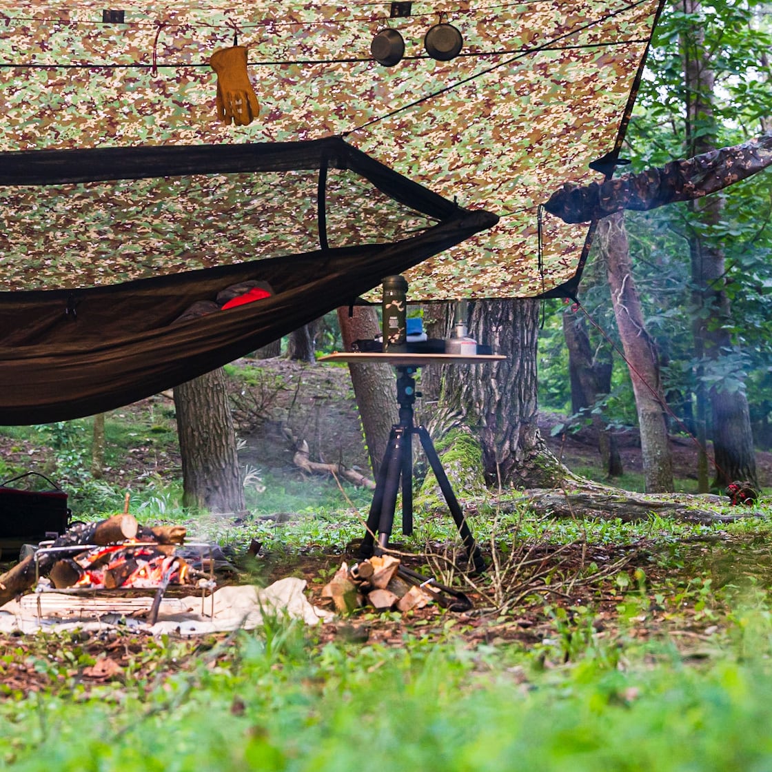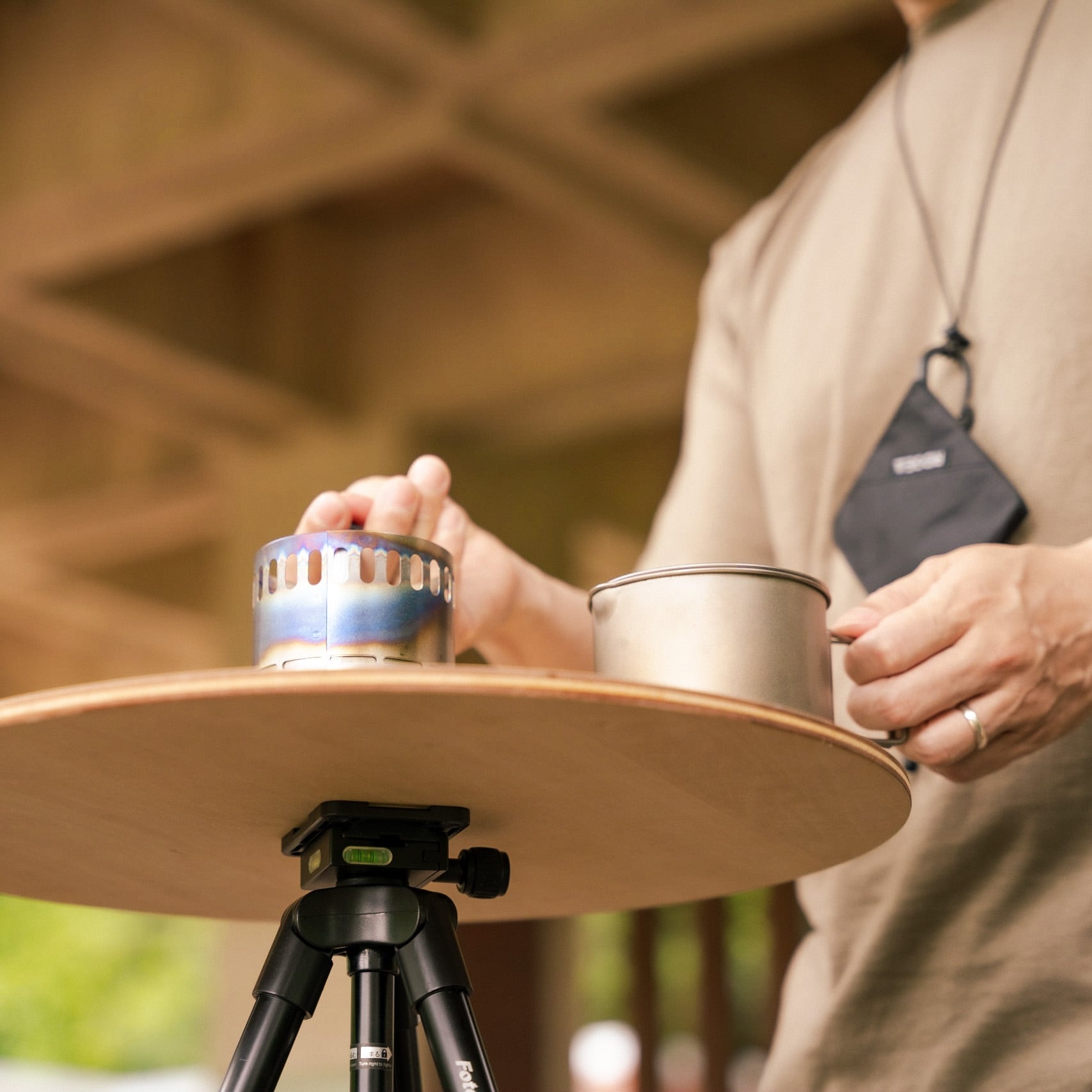 ハンモックに揺られながら「ここに飲み物があれば最高なのに」「この高さでバーナーが使えたら便利なのに」──そんな妄想がきっかけでした。欲しいのは、ハンモックの高さにぴたり合う“ちょうどいい高さと水平”。しかも、天板はその日の気分やシーンに合わせて自由に選べる。そんな仕組みがあればいいのに、と。