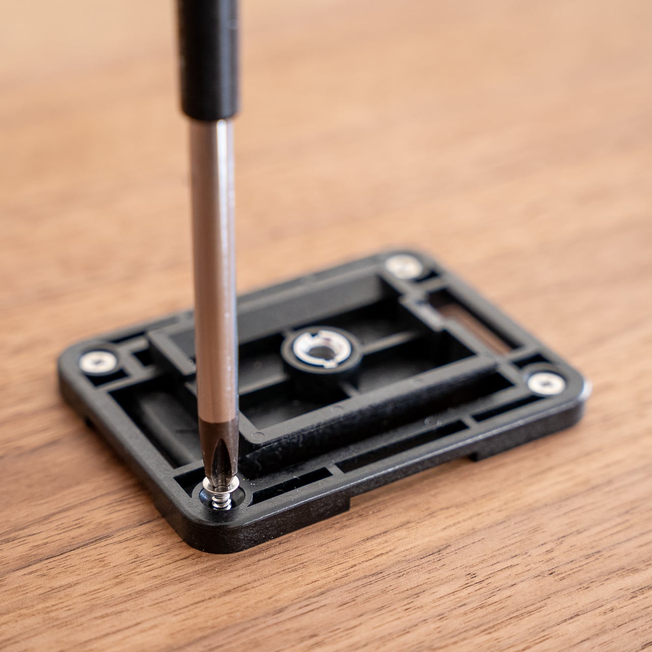 初期試作は固定穴2ヶ所。木製ボードに取り付けると外れやすいことがわかり、「これはダメだ」と4ヶ所固定に変更。取り付けの手間は増えましたが、天板の安定感は段違いになりました。