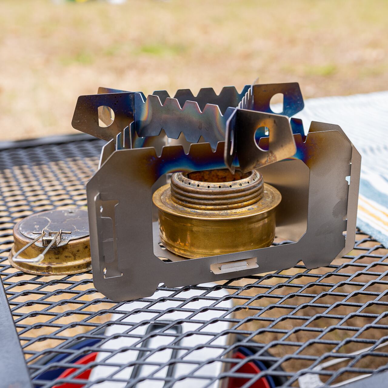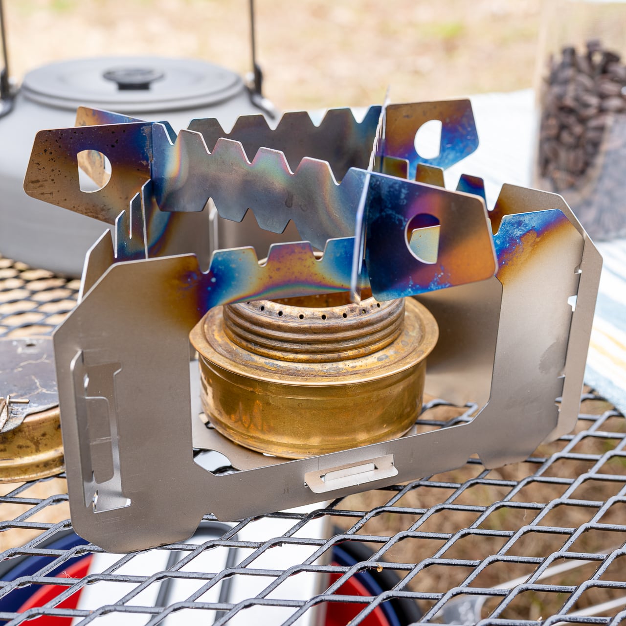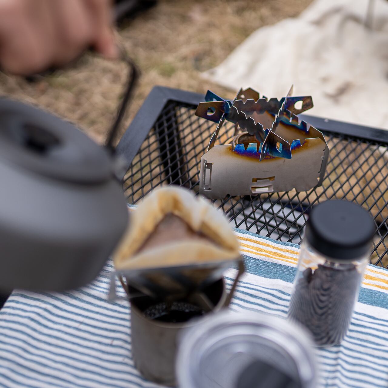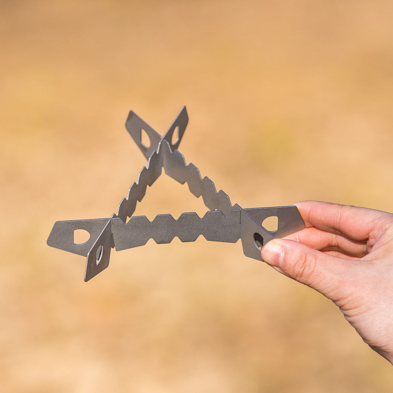 ソロキャンパーに大人気のVARGOヘキサゴンウッドストーブ。その弱点だった「小型クッカーの安定性」と「構造からのガタつき」を解決するためにデザインした、marupeinetオリジナルのチタン製カスタム五徳です。軽量・コンパクトながらも、ストーブ全体の剛性感を大きく高め、安心して調理が楽しめます。