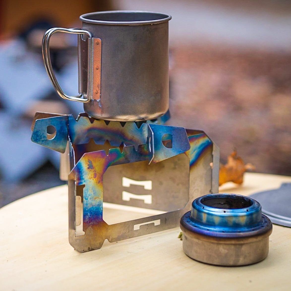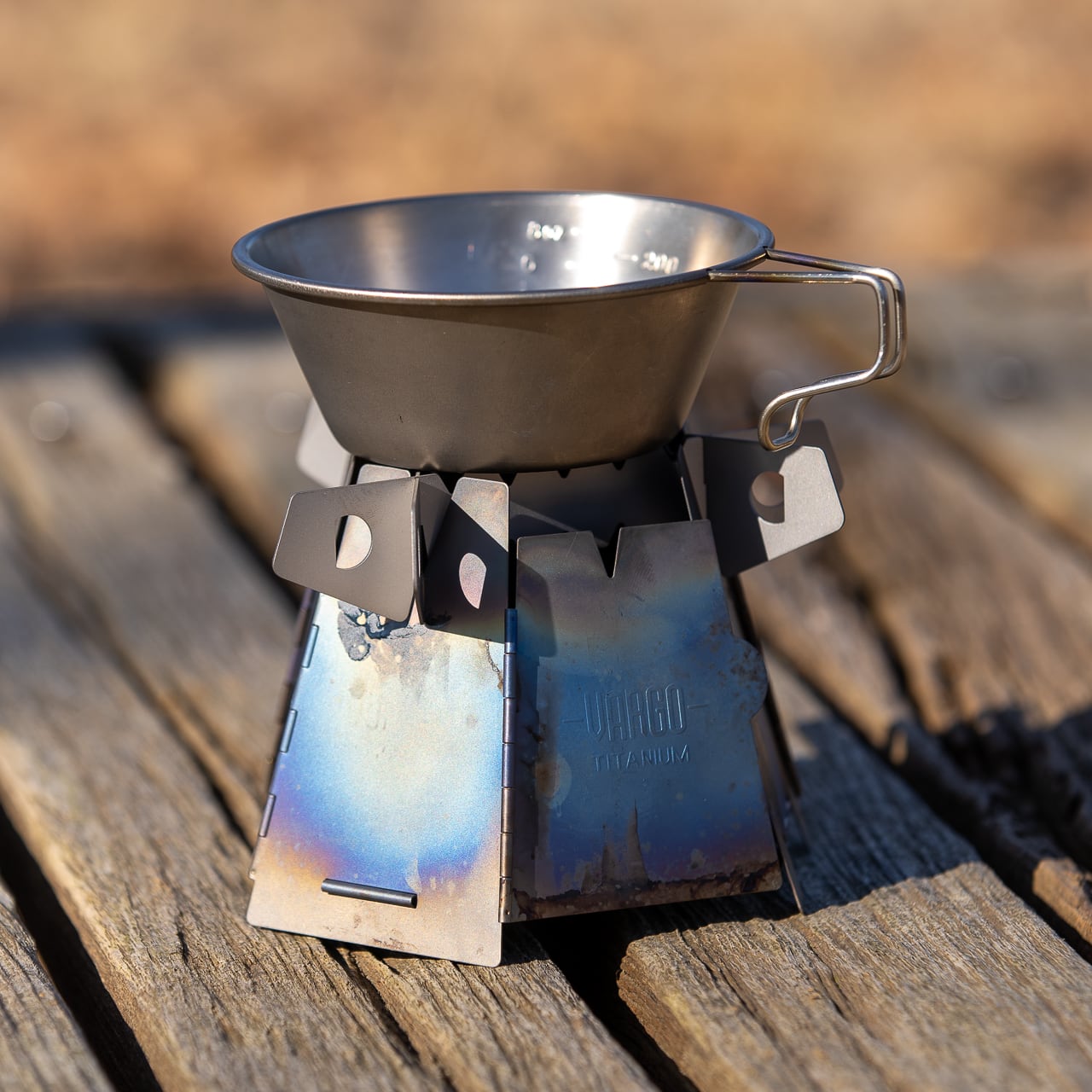 チタンはステンレスの約60%の比重。TT-02が54gに対しT3は31g、手に取れば思わず「おおっ」と声が出る軽さ。錆びにくく、熱で虹色に変わる表情も魅力です。VARGOチタニウムヘキサゴンウッドストーブと同素材で相性も抜群。