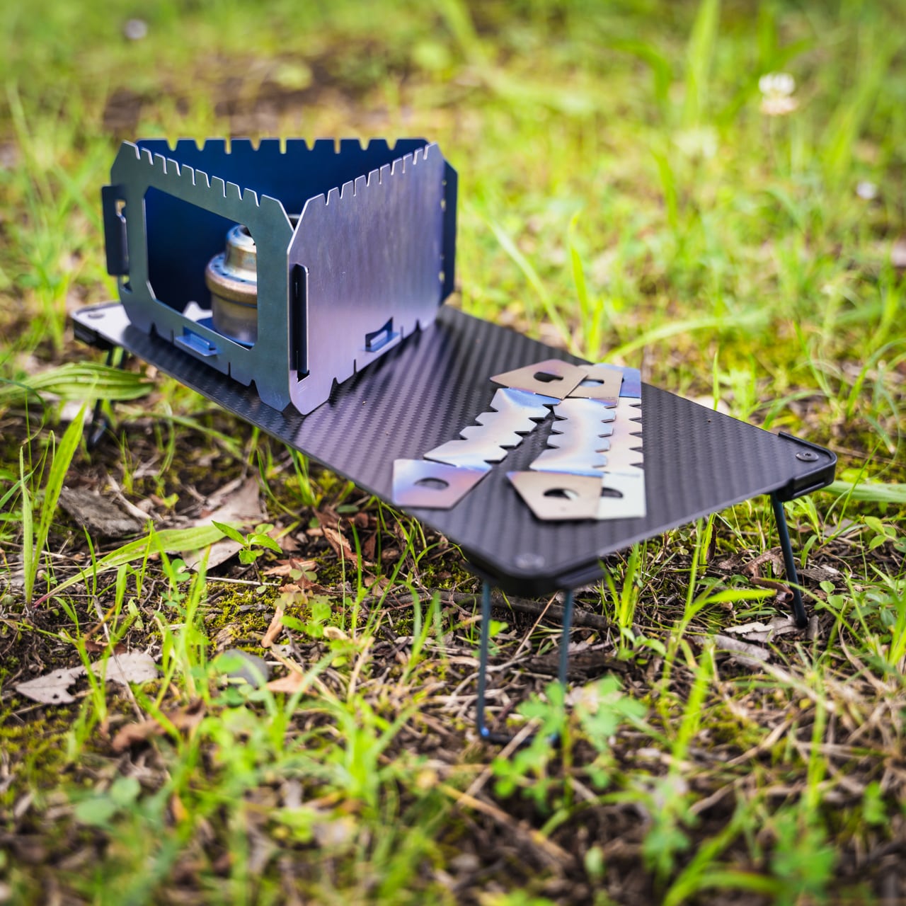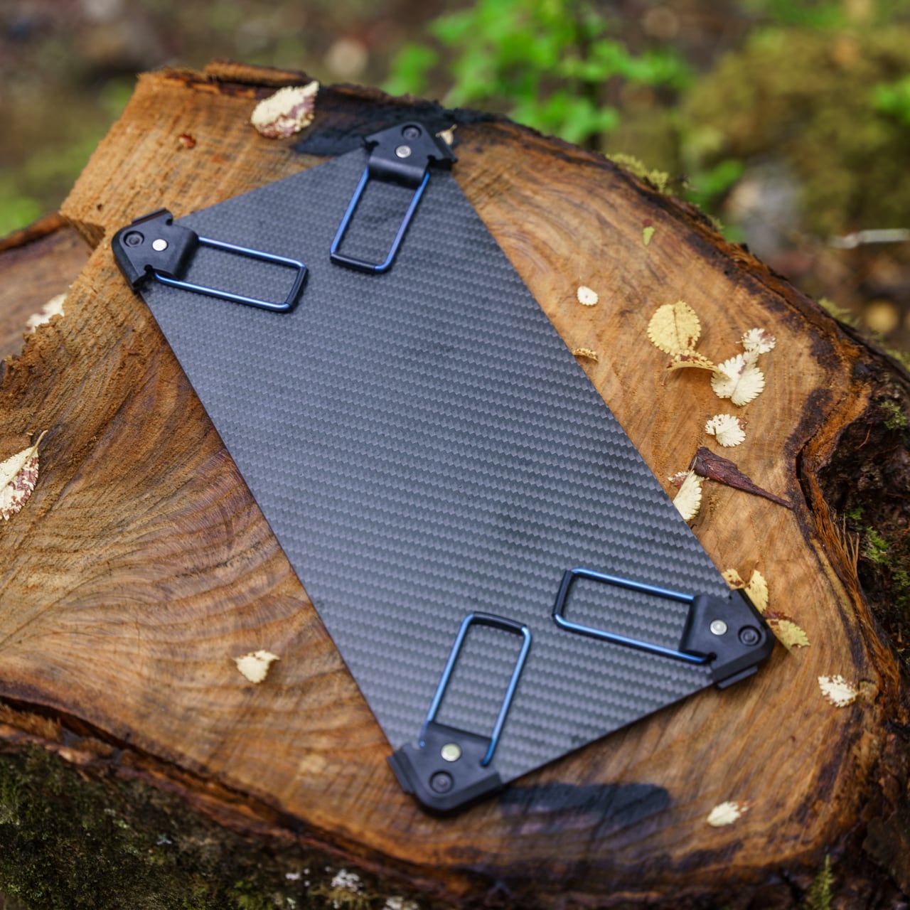 TATAMI TABLE(CARBON)は、従来190gのモデルからさらに約20%軽量化された152gのウルトラライト仕様へ。ドライカーボン天板と瑠璃色に仕上げたチタン脚を組み合わせ、軽量・高強度・耐熱性をすべて兼ね備えたプレミアムなソロ用ミニテーブルです。