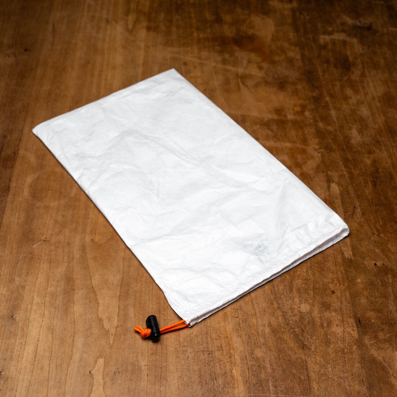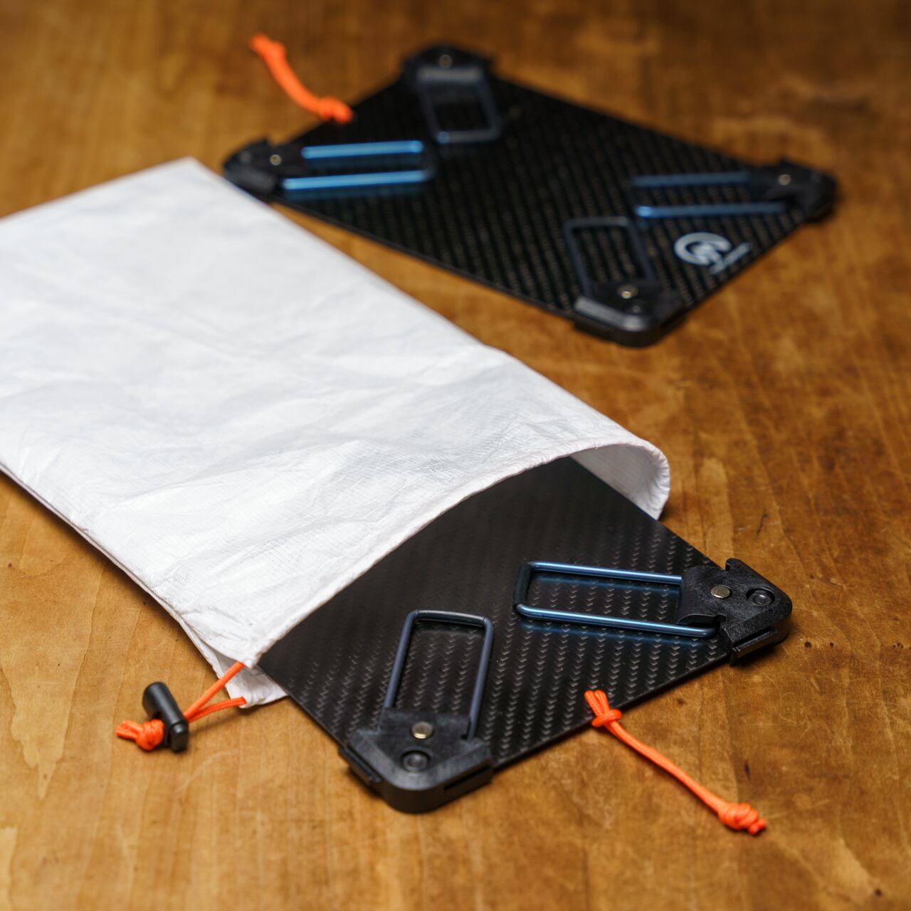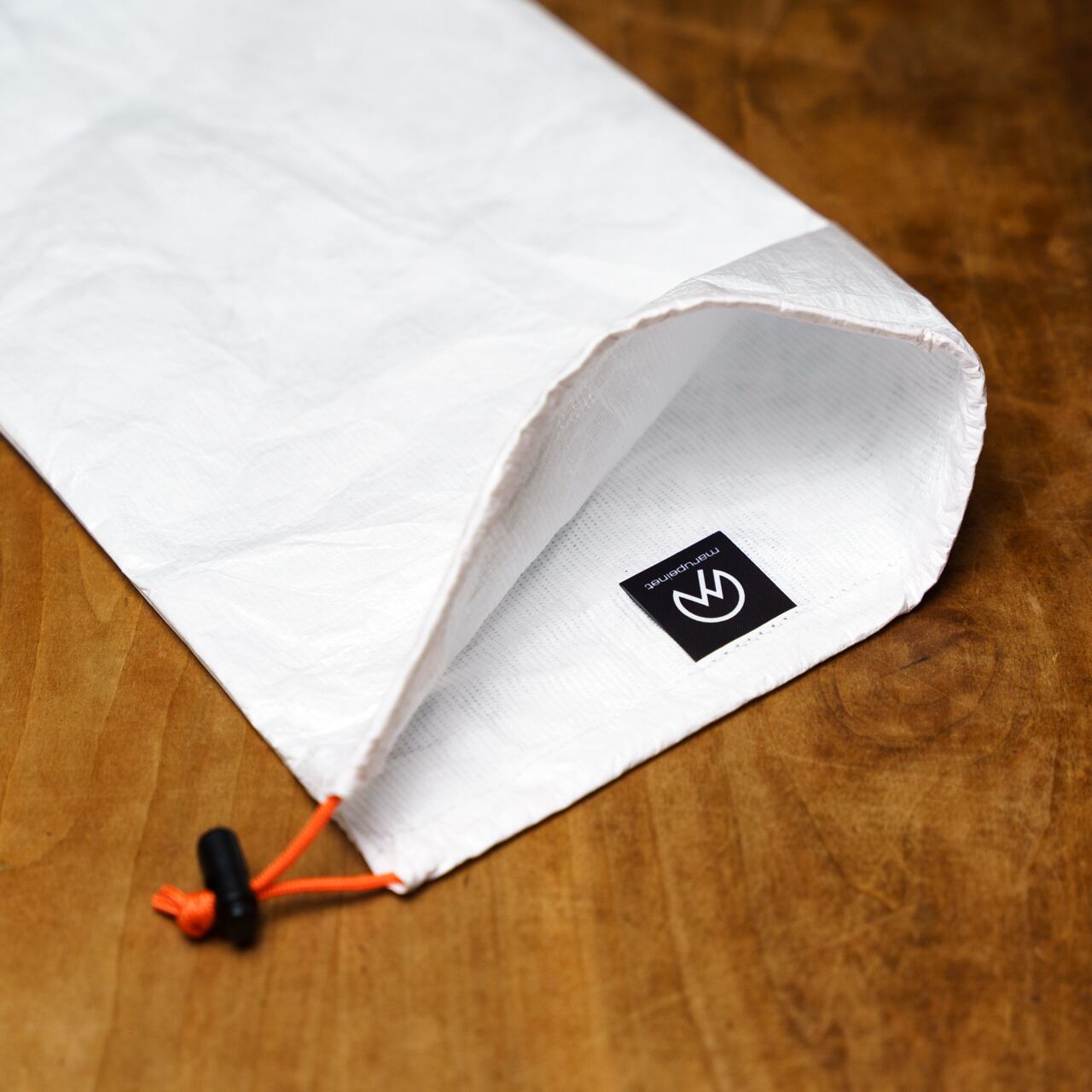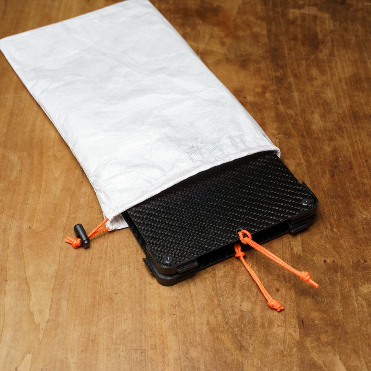 TATAmini TABLE専用に設計された、タイベック素材のスタッフサックです。わずか約8gと超軽量ながら、水や摩耗に強く、通気性も兼ね備えたユニークな収納袋。TATAmini TABLEが2枚重ねて入ります。